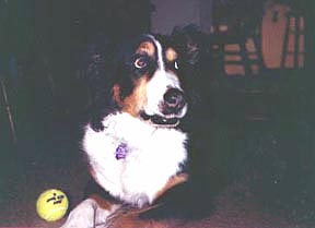 It was early evening on July 2, 1995 that Gary and I drove to Deb's to pick him up. He was a big dog, sixty-five pounds, black with white feet, a ruff and a white stripe down his face. He had copper markings and big, gentle brown eyes. His ears were upright with tulip tips. We met him in the back yard and Deb played Frisbee with him. He pounced in front of her, grinning, tongue hanging out, silently imploring her to throw it one more time. She laughed and said he would play until exhausted, but his very favorite toy was a ball. Any ball, any size, any type. His enthusiasm and joy delighted us. After signing papers and paying for some medical expenses, we squeezed the three of us in our son's small Toyota pickup and headed for home. Thus begins the story of "MacTavish".